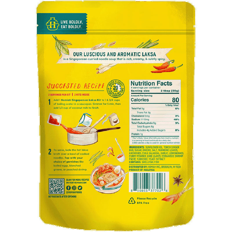 Homiah Singaporean Laksa curry paste packaging with a colorful design and images of noodles and curry.